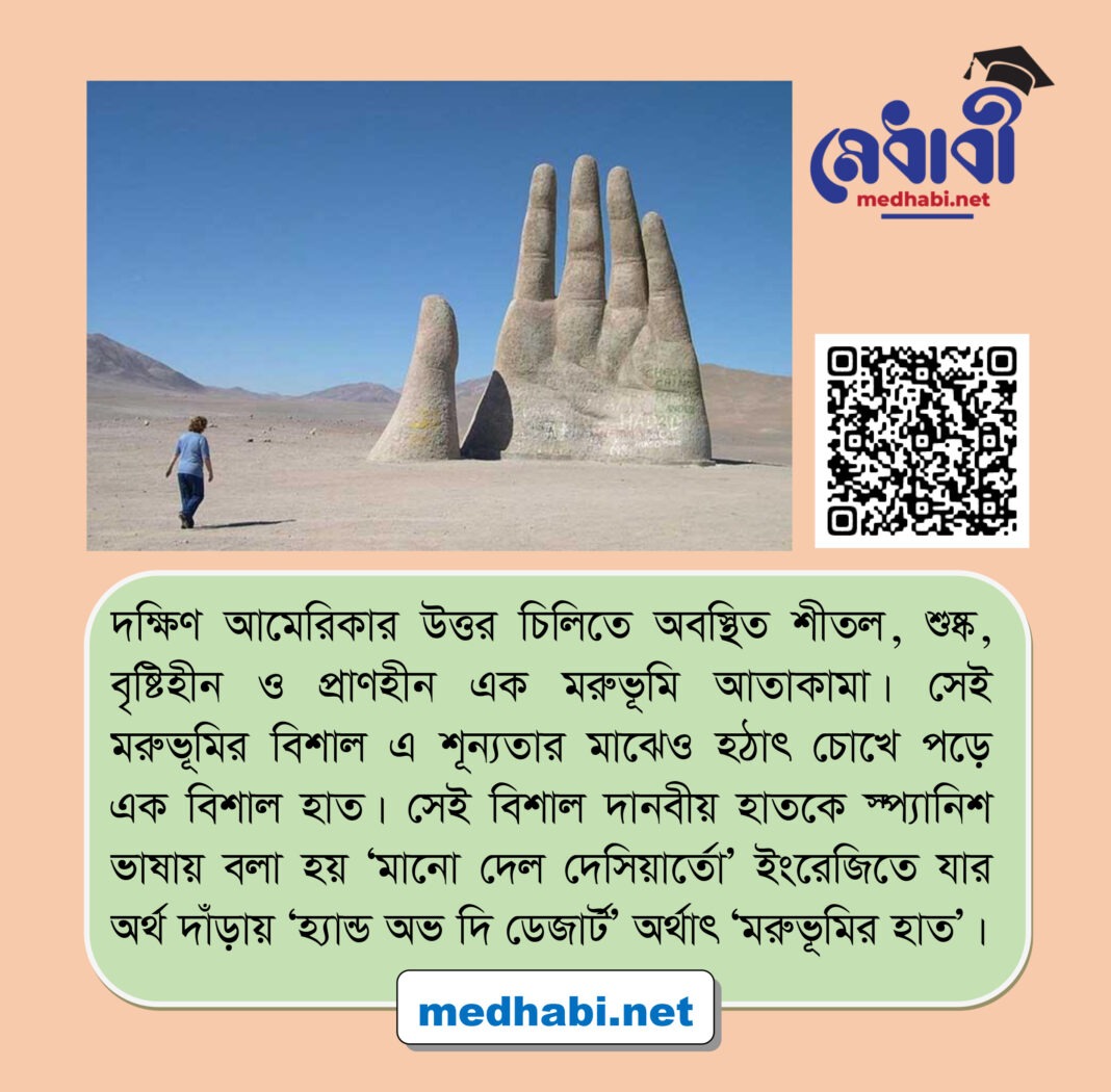 🖐 দক্ষিণ আমেরিকার উত্তর চিলিতে অবস্থিত শীতল, শুষ্ক, বৃষ্টিহীন ও প্রাণহীন এক মরুভূমি আতাকামা। সেই মরুভূমির বিশাল এ শূন্যতার মাঝেও হঠাৎ চোখে পড়ে এক বিশাল হাত। সেই বিশাল দানবীয় হাতকে স্প্যানিশ ভাষায় বলা হয় ‘মানো দেল দেসিয়ার্তো’ ইংরেজিতে যার অর্থ দাঁড়ায় ‘হ্যান্ড অভ দি ডেজার্ট’ অর্থাৎ ‘মরুভূমির হাত’।
