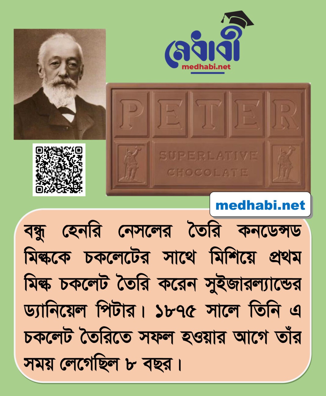 বন্ধু হেনরি নেসলের তৈরি কনডেন্সড মিল্ককে চকলেটের সাথে মিশিয়ে প্রথম মিল্ক চকলেট তৈরি করেন সুইজারল্যান্ডের ড্যানিয়েল পিটার। ১৮৭৫ সালে তিনি এ চকলেট তৈরিতে সফল হওয়ার আগে তাঁর সময় লেগেছিল ৮ বছর।